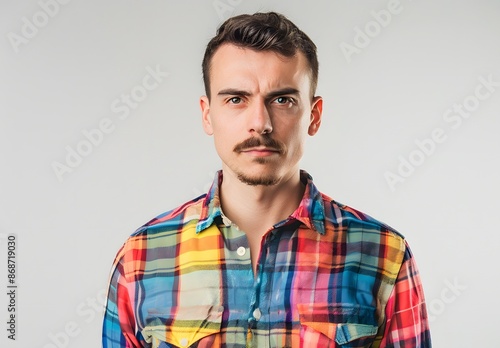 Young Handsome Man in Colorful Plaid Shirt with Angry Expression
