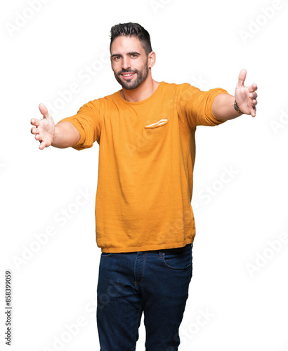 Young handsome man over isolated background looking at the camera smiling with open arms for hug. Cheerful expression embracing happiness.