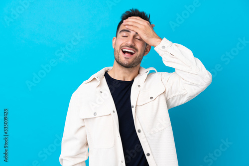 Young handsome man over isolated blue background laughing