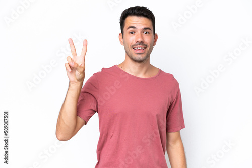 Young handsome man over isolated white background smiling and showing victory sign