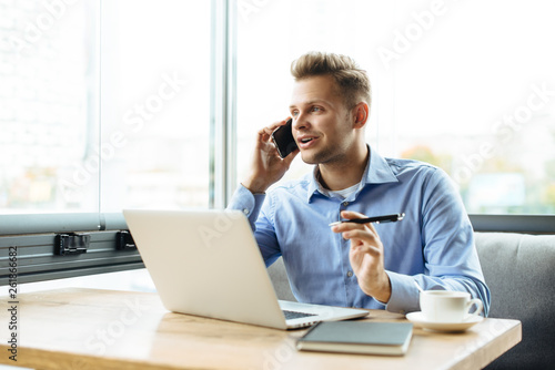 Young handsome man sitting in office with cup of coffee and working on project connected with modern cyber technologies. Businessman with notebook trying to keep deadline in digital marketing sphere.