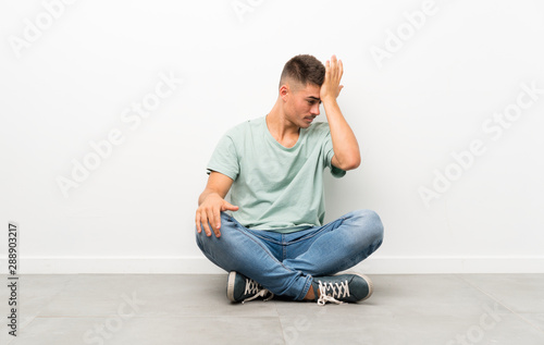 Young handsome man sitting on the floor having doubts with confuse face expression