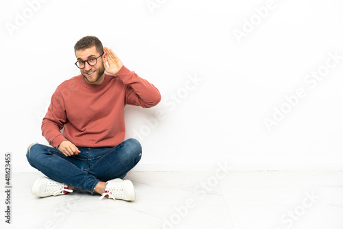 Young handsome man sitting on the floor listening to something by putting hand on the ear