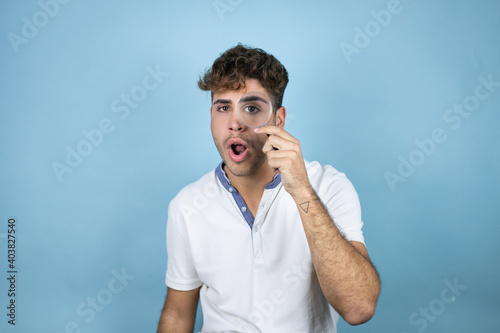 Young handsome man wearing a white t-shirt over blue background surprised looking through a magnifying glass
