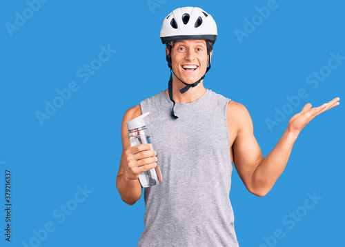Young handsome man wearing bike helmet holding bottle of water celebrating victory with happy smile and winner expression with raised hands