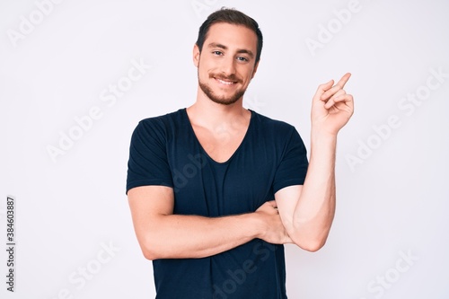 Young handsome man wearing casual clothes smiling happy pointing with hand and finger to the side