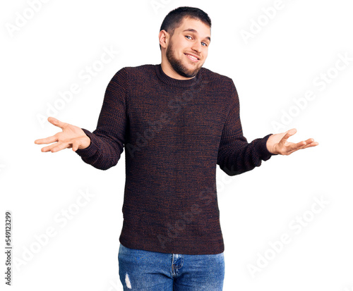 Young handsome man wearing casual sweater clueless and confused expression with arms and hands raised. doubt concept.