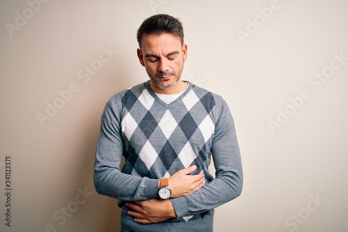 Young handsome man wearing casual sweater standing over isolated white background with hand on stomach because indigestion, painful illness feeling unwell. Ache concept.