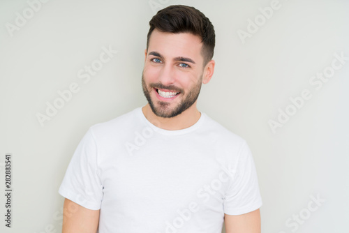 Young handsome man wearing casual white t-shirt over isolated background looking away to side with smile on face, natural expression. Laughing confident.