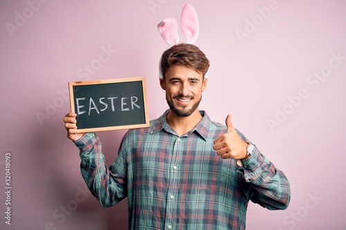 Young handsome man wearing cute easter rabbit ears and holding blackboard with holiday word happy with big smile doing ok sign, thumb up with fingers, excellent sign