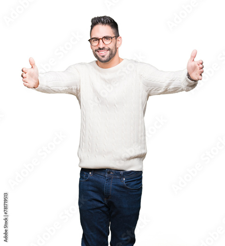 Young handsome man wearing glasses over isolated background looking at the camera smiling with open arms for hug. Cheerful expression embracing happiness.