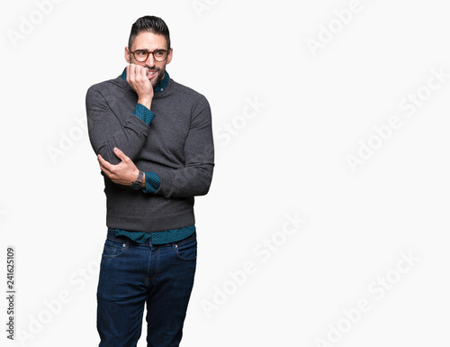 Young handsome man wearing glasses over isolated background looking stressed and nervous with hands on mouth biting nails. Anxiety problem.