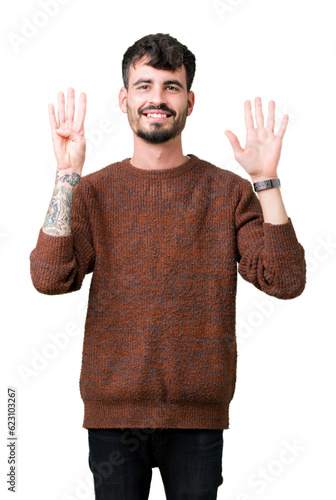 Young handsome man wearing winter sweater over isolated background showing and pointing up with fingers number nine while smiling confident and happy.