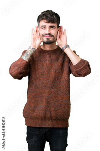 Young handsome man wearing winter sweater over isolated background Trying to hear both hands on ear gesture, curious for gossip. Hearing problem, deaf