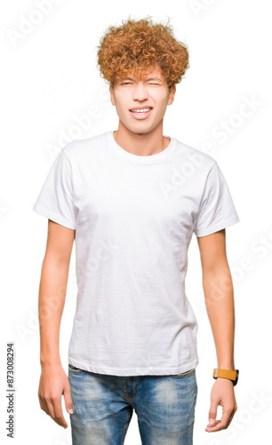 Young handsome man with afro hair wearing casual white t-shirt winking looking at the camera with sexy expression, cheerful and happy face.