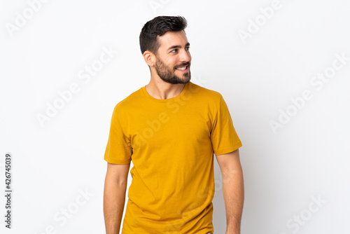 Young handsome man with beard isolated on white background looking to the side and smiling