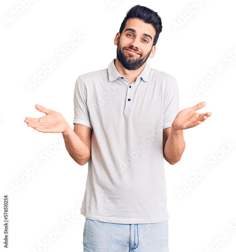 Young handsome man with beard wearing casual polo clueless and confused expression with arms and hands raised. doubt concept.
