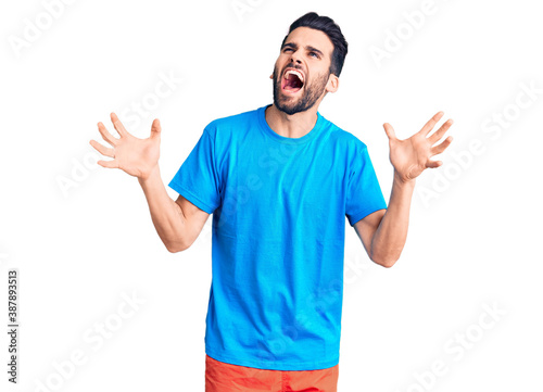 Young handsome man with beard wearing casual t-shirt crazy and mad shouting and yelling with aggressive expression and arms raised. frustration concept.