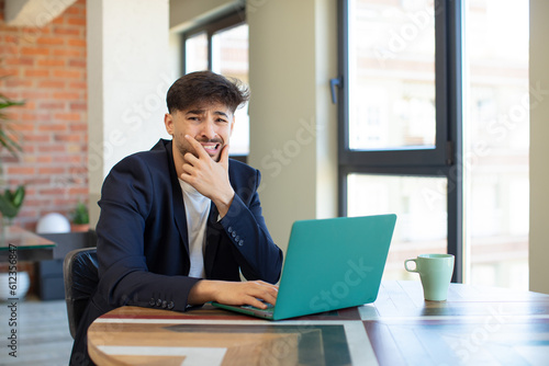 young handsome man with mouth and eyes wide open and hand on chin. freelance concept with laptop