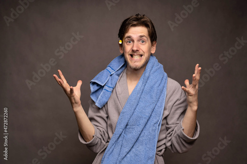 Young handsome tall slim white man with brown hair shining with excitement after shower in grey bathrobe on grey background