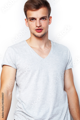 young handsome teenage hipster guy posing emotional, happy smiling against white background isolated, lifestyle people concept