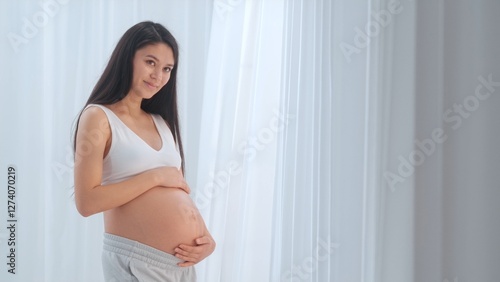 Young happy Asian pregnant woman posing in studio with white curtains in background