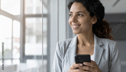 Young Happy Businesswoman Using Smartphone and Looking Away Thoughtfully in Office