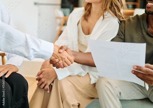 Young happy couple and an agent in a new property shaking hands or with advisor in office