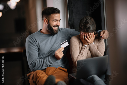 Young happy couple. Couple shopping online.