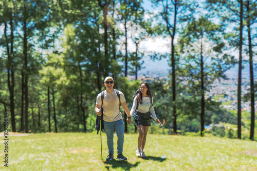 Young Happy Couple Hiking in the Nature Forest Loking direction and enjoying national park trekking