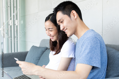 Young happy couple holding and looking ultrasound scan of their baby on couch in the living room at home. Concept of Pregnancy health care.
