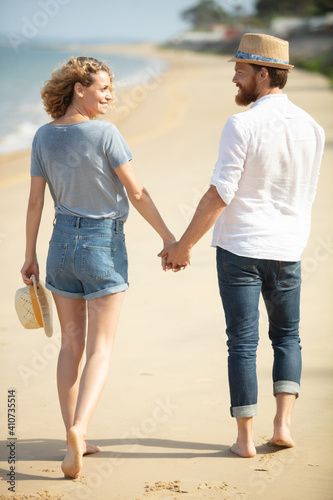 young happy couple walking on beach smiling holding hands