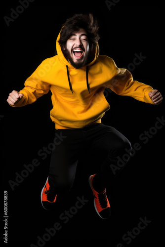 young happy man jumping, full length portrait, isolated on black background. Generative AI
