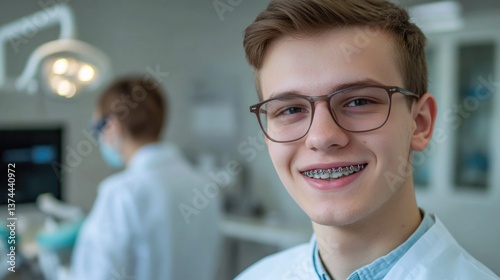 Young happy man with braces on his teeth smiles in a modern dental clinic, with an orthodontist wearing glasses in the background. High quality photo