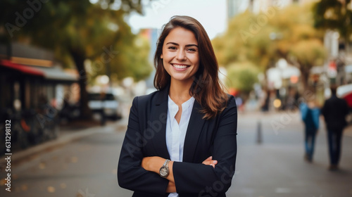 Young happy pretty smiling professional business woman, happy confident positive female entrepreneur standing outdoor on street arms crossed, looking at camera