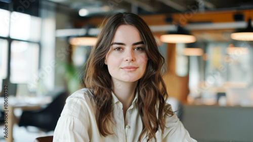 Young happy smiling professional business woman, female company worker or corporate manager holding digital tablet technology posing in modern office working, looking at camera, portrait.