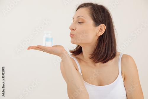 Young happy woman advertising useful vitamins for women closeup, white background. Holding in hand and pointing at jar of pills, disease treatment. Female health and reproductive capacity concept
