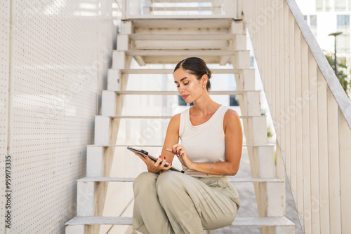 Young happy woman sit on stairs and use digital tablet