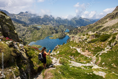 Young hiker girl summit to Ratera Peak in Aiguestortes and Sant Maurici National Park, Spain