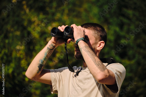 Young hiker man using binoculars while standing on a lookout in autumn forest. Bearded traveler guy holding binoculars outdoor. A man watches birds and wildlife.