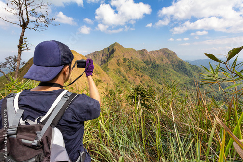 Young hiker taking a photography along path of terkking. Photographer taking photo at mountain peak.