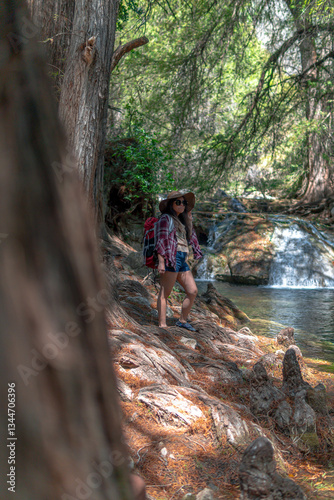 Young hiker woman exploring a river and waterfall in the forest