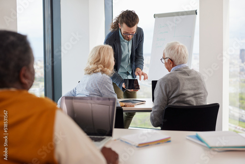 Young hipster educator teaching a multicultural group of senior students how to use the internet in the classroom.