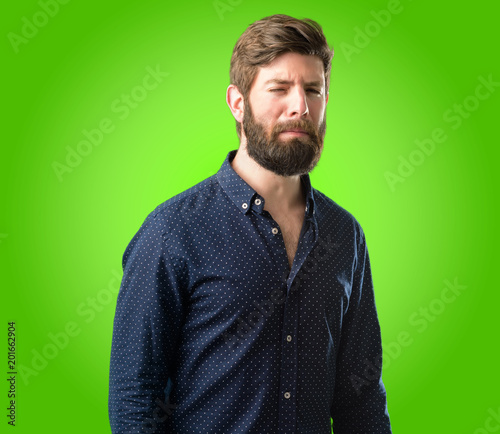Young hipster man with big beard with sad and upset expression, unhappy over green background
