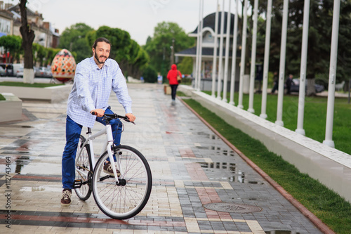 young hipster man with fixed gear bike on city street