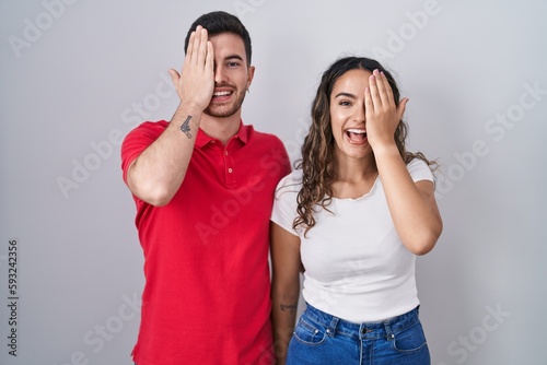 Young hispanic couple standing over isolated background covering one eye with hand, confident smile on face and surprise emotion.