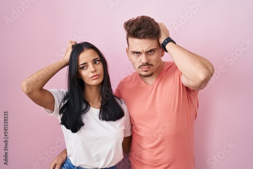 Young hispanic couple standing over pink background confuse and wondering about question. uncertain with doubt, thinking with hand on head. pensive concept.