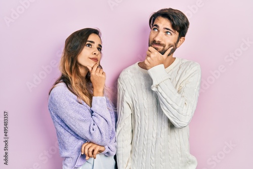 Young hispanic couple wearing casual clothes with hand on chin thinking about question, pensive expression. smiling with thoughtful face. doubt concept.
