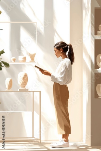 Young Hispanic female curator analyzing historical artifacts in a modern museum environment