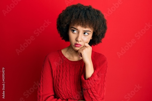 Young hispanic girl wearing casual clothes serious face thinking about question with hand on chin, thoughtful about confusing idea